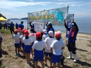 令和7年6月25日、笠岡市内小学校の生徒さんをお招きし、黒メバルの稚魚5000匹を放流しました。また、笠岡の海についての説明やおさかなクイズもあり、生徒さんに環境保護について学んで頂くことができました。